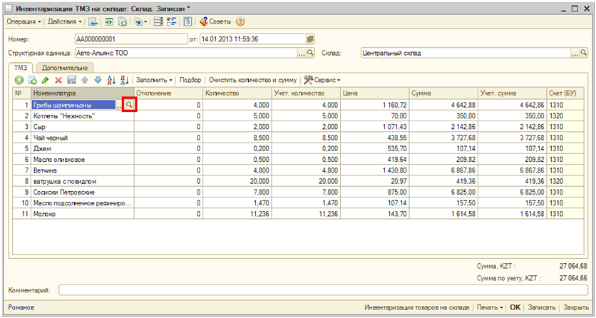 Рассмотрим проведение инвентаризации на складе с помощью терминала сбора данных. Сначала заполняем документ «Инвентаризация ТМЗ на складе» по остаткам.