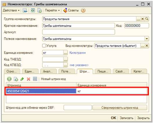Затем внести в табличную часть «Штрих-код» справочника «Номенклатура» соответствующий штрих-код.