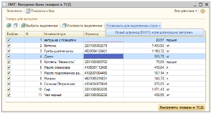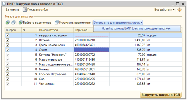 Для номенклатуры, у которой нет штрих-кода, необходимо сгенерировать его. Для этого необходимо выделить строки с незаполненными штрих-кодами и воспользоваться меню «Установить для выделенных строк» — «Новый штрих-код EAN13, если штрих-код не заполнен».