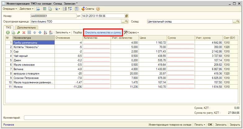 С помощью терминала сбора данных у всего товара, находящегося на складе, считывается штрих-код, при этом в терминале сбора данных будет заполняться таблица с фактическими остатками на складе. После инвентаризации в табличной части документа необходимо очистить количество и сумму.