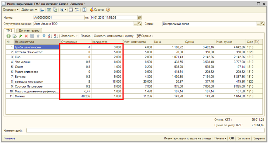 После этого в колонку «Количество» будет помещено фактическое количество товара на складе, а в колонке «Отклонение» будет отображена разница фактического и учетного количества.