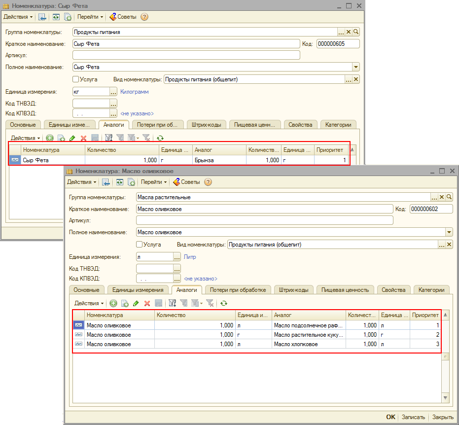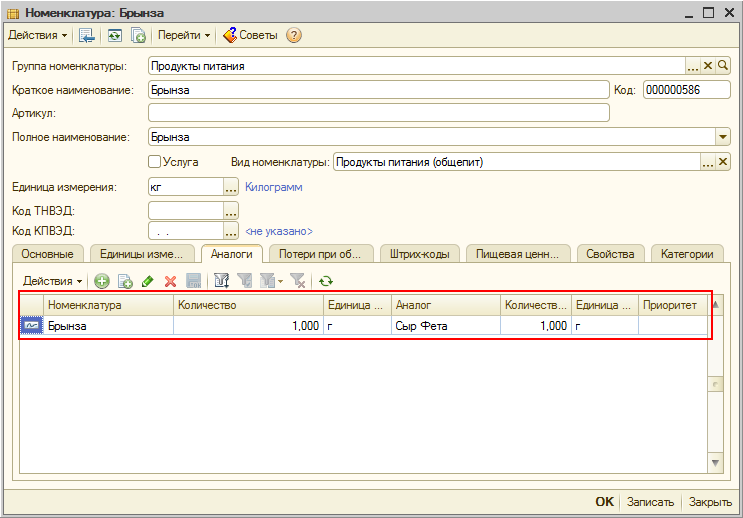 Следует обратить внимание на то, что установка аналогов не имеет обратного действия. Например, в нашем случае для номенклатуры «Сыр Фета», сведения о наличии аналога заданы. В дальнейшем, в документе выпуска продукции, при необходимости, можно заменить ингредиент «Сыр Фета» аналогом «Брынза». Однако, для того, чтобы было возможно в документе выпуска продукции указать для ингредиента «Брынза» замену аналогом «Сыр Фета», нам потребуется указать сведения о наличии аналога для номенклатуры «Брынза».