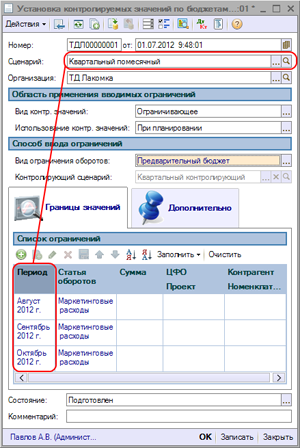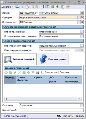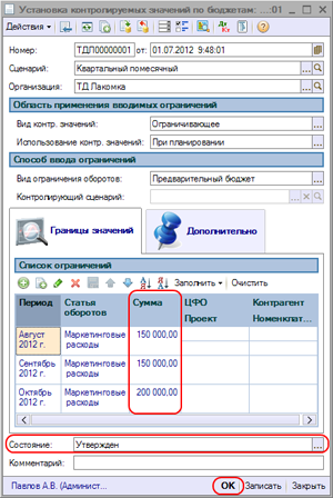 В колонке «Сумма» табличной части документа установим суммы ограничений для каждого периода, в реквизите «Состояние» установим значение «Утвержден» и проведем документ.