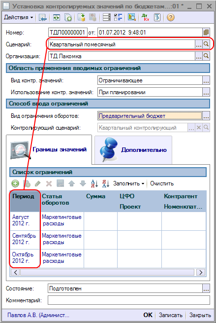 В колонке «Сумма» табличной части документа установим суммы ограничений для каждого периода, в реквизите «Состояние» установим значение «Утвержден» и проведем документ.