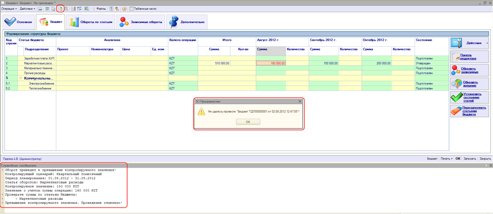 Далее рассмотрим каким образом будет действовать созданная настройка. Для этого создадим новый документ «Бюджет» с видом бюджета «Бюджет административных затрат» и сценарием планирования «Квартальный помесячный». И для статьи бюджета «Маркетинговые расходы» на август месяц укажем сумму, превышающую 150 000 тг. При проведении документа «Бюджет» системой будет выдано сообщение о превышении установленного лимита и документ не будет проведен.