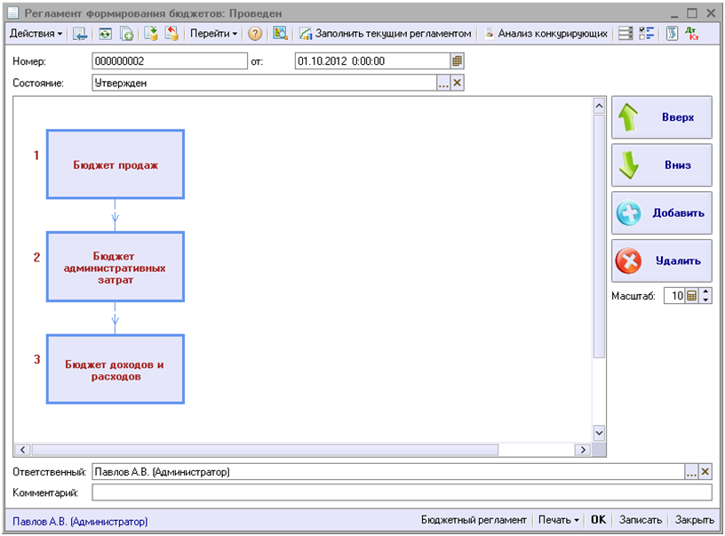 После определения видов бюджетов необходимо определить порядок формирования созданных бюджетов или бюджетный регламент. Порядок формирования бюджетов необходим для разрешения конфликтных ситуаций, которые могут возникнуть в том случае, если одна и та же статья оборотов соответствует статьям различных бюджетов. Регламент определяет, будут ли такие бюджеты одновременно формировать обороты по общим статьям оборотов (по накопительному типу), либо один бюджет будет формироваться раньше, и суммы, введенные в данном бюджете по статьям оборотов, будут наследоваться другими бюджетами, использующими эти же статьи. Таким образом, регламент определяет «места» возникновения оборотов по статьям оборотов по бюджетам.