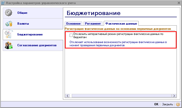 Интерактивная регистрация фактических данных по бюджетам представляет собой формирование оборотов бюджетов и проводок по плану счетов бюджетирования непосредственно в момент проведения первичных документов бухгалтерского учета, согласно настроенным пользователем схемам отражения фактических данных в бюджетах.Для использования схем интерактивного отражения, в «Настройках параметров управленческого учета» должно быть разрешено их применение (параметр «Отключить интерактивный режим регистрации фактических данных по бюджетам» должен быть отключен).