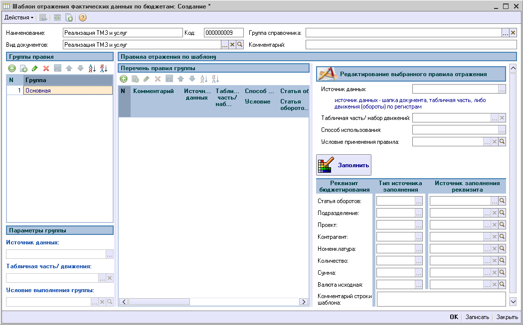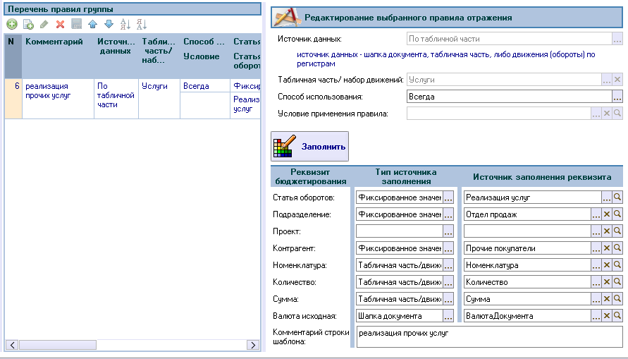 Поля «Центр финансовой ответственности» и «Контрагент» правила отражения, полученные при автозаполнении, также будут иметь фиксированные значения. Внесем изменения по типу источника заполнения для полей «Номенклатура», «Количество», «Сумма», «Валюта исходная». «Табличная часть/движения» - установим для полей «Номенклатура», «Количество», «Сумма», так как обороты по бюджету будут формироваться с учетом этих полей. Для поля «Валюта исходная» тип заполнения источника укажем «По шапке документа», а в качестве источника заполнения реквизита по кнопке выбора укажем «Валюта документа». В поле «Комментарий строки шаблона» для строки списка правил отражения укажем «Реализация прочих услуг». Закончим редактирование, все внесенные изменения отразятся в строке табличной части «Перечень правил группы». Сохраним шаблон отражения фактических данных, затем укажем его в табличной части «Состав наборов шаблона» справочника «Наборы шаблонов отражения первичных данных в бюджетах».