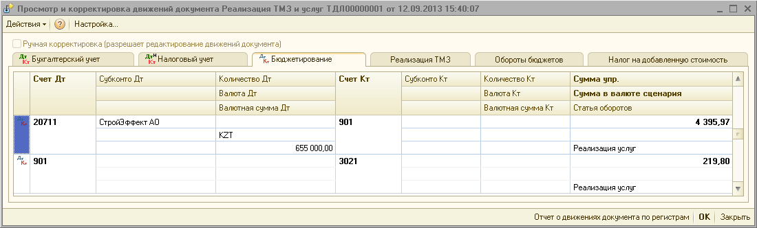 Так как для этой статьи оборотов настроено отражение по плану счетов бюджетирования, на закладке «Бюджетирование» формы «Просмотр и корректировка движений документа» сформированы проводки по бюджетному плану счетов.
