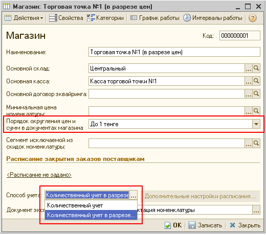 В реквизите «Порядок округления цен и сумм в документах магазина» для каждого магазина также задается порядок округления цен и сумм в документах. Указанный способ округления будет применен при автоматическом расчете цен и сумм в документах по складскому учету.