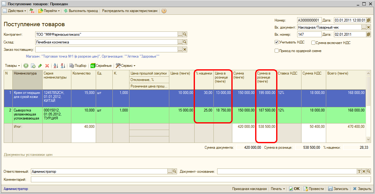 В колонке «Розничная цена прошлой закупки» табличной части документа «Поступление товаров» отображается последняя розничная цена, по которой поступила выбранная номенклатура. В колонке «% наценки» указывается процент розничной наценки для текущей номенклатуры. При заполнении данной колонки автоматически вычисляются значения колонок «Цена в рознице» и «Сумма в рознице». Колонка «Цена в рознице» содержит розничную цену номенклатуры. При изменении значения в этой колонке происходит пересчет процента наценки и суммы в рознице. При проведении документа сохраняются сведения как по ценам закупки, так и по розничным ценам.