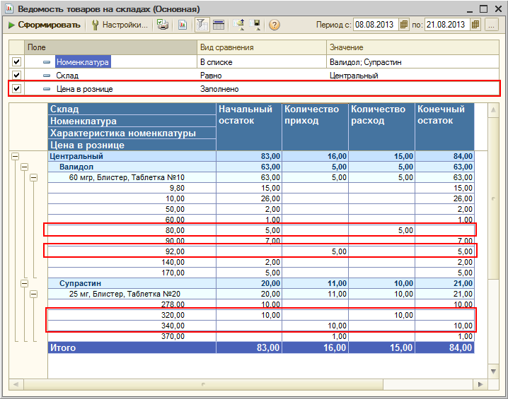 Получить данные по остаткам товаров в разрезе новых розничных цен можно при помощи отчета «Ведомость товаров на складах». В настройках отчета необходимо добавить в область отбора поле «Цена в рознице» с видом сравнения «Заполнено».