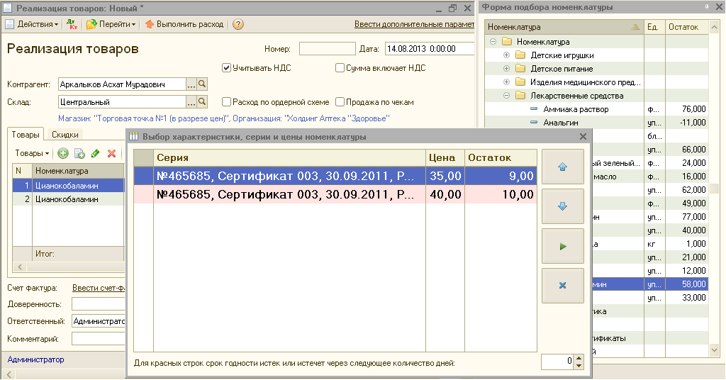 Оформление операции реализации лекарственных средств с учетом того, что остатки хранятся в разрезе нескольких розничных цен, осуществляется следующим образом. При подборе реализуемых лекарственных средств в табличную часть документа «Реализация товаров» открывается специальная форма выбора номенклатуры, представляющая собой список комбинаций характеристик, серий и цен, по которым на складе имеются остатки.