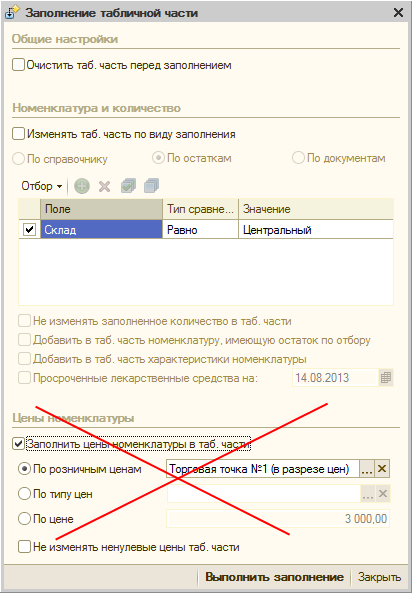 Следует обратить внимание на то, что при заполнении табличной части документа «Реализация товаров» при помощи обработки «Заполнение табличной части» флажки «Заполнить цены номенклатуры в таб. части» и «По розничным ценам» устанавливать не нужно!