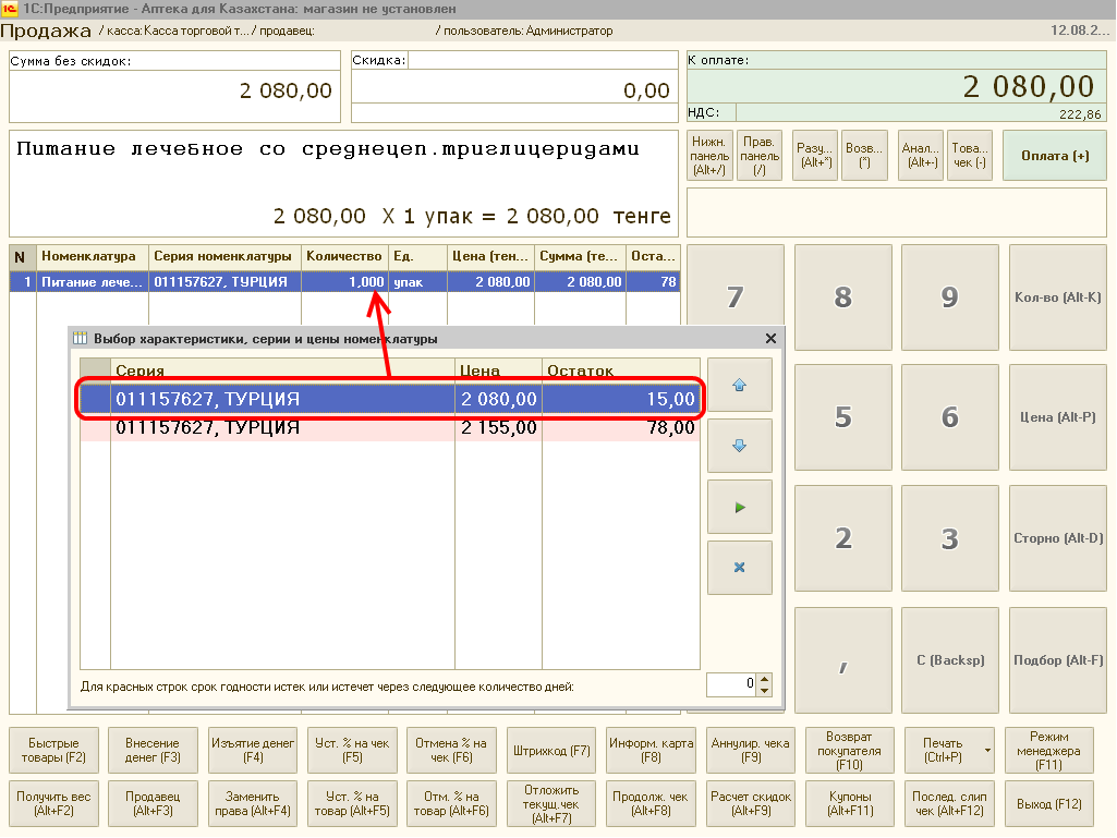 В режиме РМК лекарственное средство может быть добавлено в текущий чек как при считывании штрих-кода, так при использовании окна подбора. И в том, и другом случае добавления, если номенклатура имеет остатки по различным ценам, появится уже знакомое диалоговое окно выбора характеристики, серии и цены номенклатуры, где пользователю необходимо самостоятельно выбрать позицию с нужной ценой.