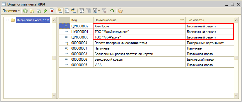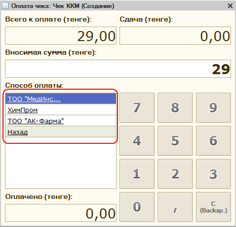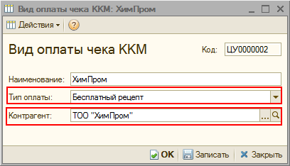 Если аптекой заключены договора на предоставление лекарственных средств по бесплатным рецептам с несколькими контрагентами, то для каждого контрагента необходимо создать отдельный вид оплаты чека ККМ.