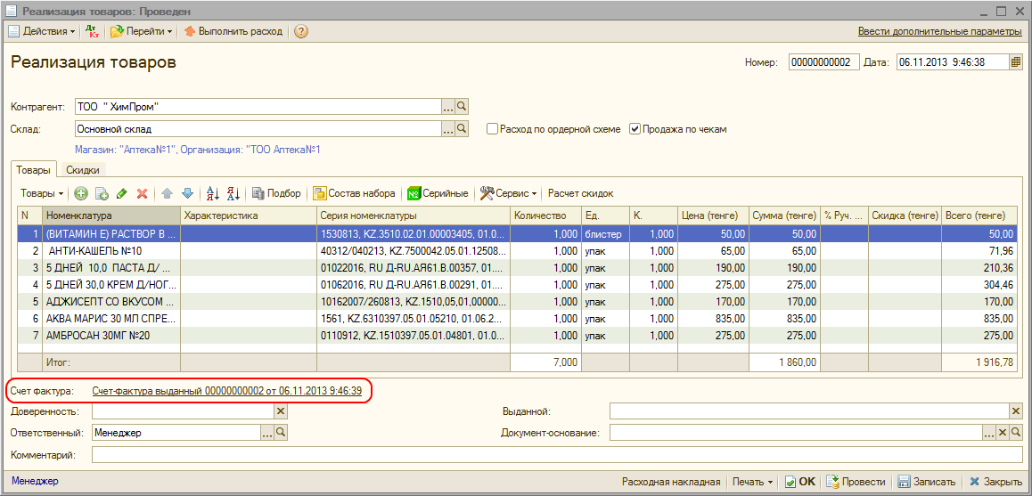 При нажатии на кнопку «Закрыть смену» происходит закрытие чеков и создание документов «Реализация товаров». Информация из чеков по бесплатным рецептам переносится в табличную часть документа «Реализация товаров». Система автоматически создаст несколько документов «Реализация товаров», при этом, для каждого контрагента будет создан отдельный документ, в который будут включены данные по всем чекам, оформленными по соответствующему контрагенту и виду оплаты.