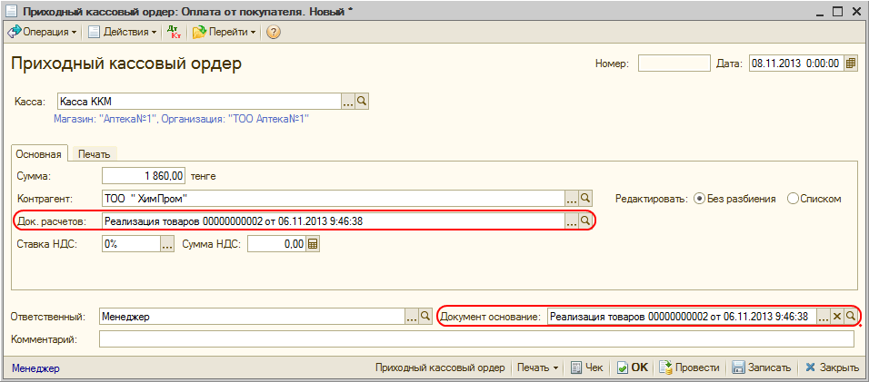 Для учета поступления денежных средств в кассу, на основании проведенного документа «Реализация товаров», можно ввести документ «Приходный кассовый ордер».