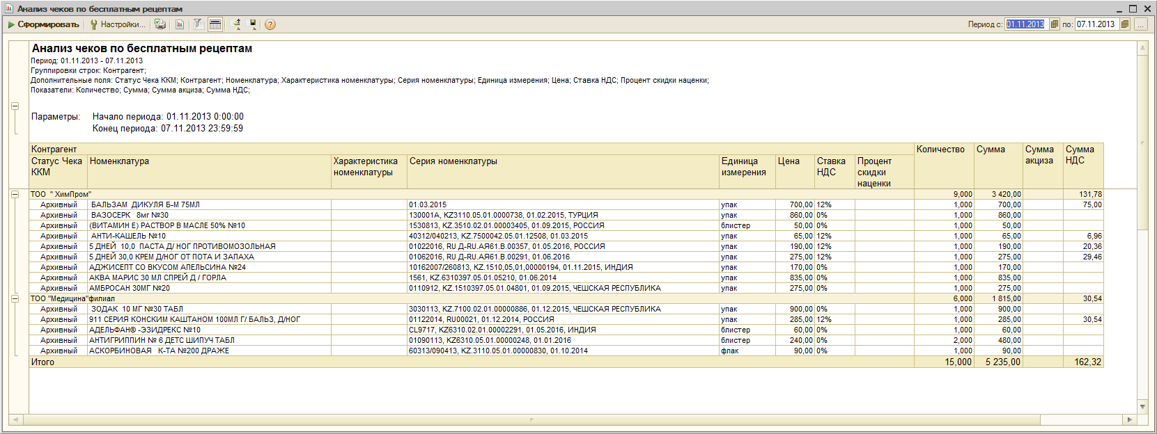 Данный отчет позволяет получить информацию обо всех лекарственных средствах, которые были отпущены по бесплатным рецептам за указанный период по каждому контрагенту в количественном и суммовом выражении.