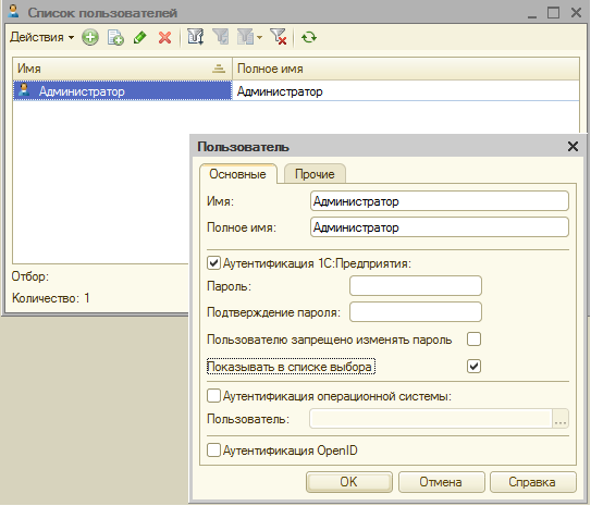 При установленном флаге «Пользователю запрещено изменять пароль» — пользователь не сможет самостоятельно изменить свой пароль. Для того, чтобы созданный пользователь отображался в списке выбора окна авторизации, необходимо установить признак «Показывать в списке выбора», иначе нужно будет при авторизации вводить имя пользователя вручную. Для пользователя можно не задавать пароль для входа в программу, а использовать тот, который вводится при входе в систему Windows. В этом случае необходимо установить флаг «Аутентификация Windows» и выбрать нужного пользователя из списка зарегистрированных пользователей.