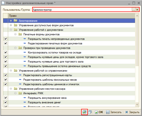 Для каждого пользователя могут быть установлены дополнительные права на изменение той или иной информации в информационной базе. Запустите конфигурацию под пользователем «Администратор» в режиме «Предприятие» и выберите меню «Сервис» — «Пользователи» — «Настройка дополнительных прав пользователей». В открывшейся форме настроек прав для пользователя «Администратор» воспользуйтесь командой «Отметить все права».