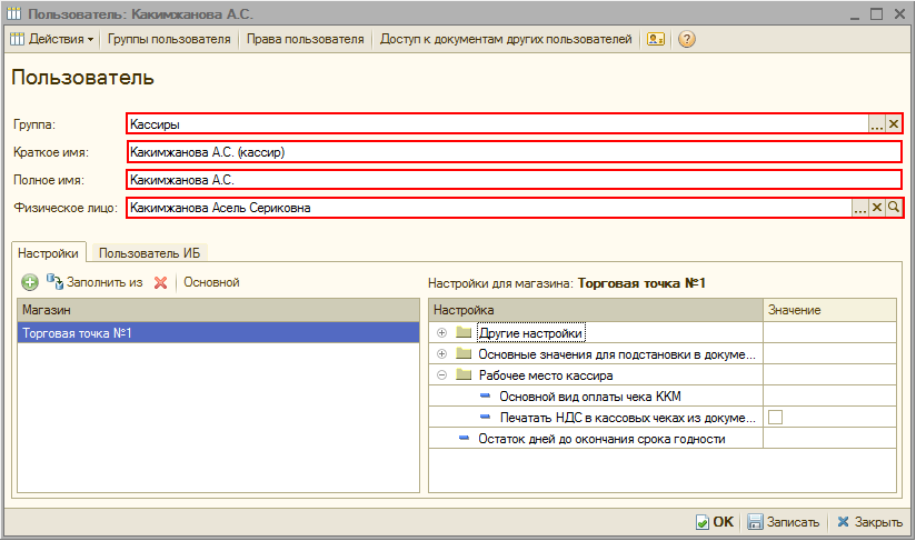 Перейдите на закладку «Пользователи ИБ» и для каждого пользователя определите роль. Например, для работников склада, менеджеров, осуществляющих приемку товаров, а также для менеджеров, которые осуществляют оптовую продажу товаров, должна быть определена роль «Менеджер магазина». Для кассиров ККМ, которые оформляют розничную продажу, а также для администраторов касс ККМ определите роль «РМК» (рабочее место кассира). Для руководства аптеки должна быть определена роль «Полные права».