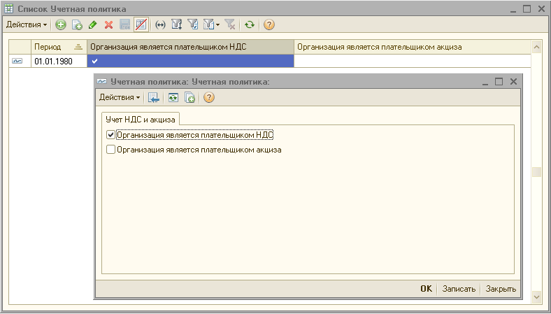 После того, как были заполнены сведения об организации можно перейти к настройке учетной политики. Для перехода к настройке выберите меню «Сервис» — «Настройка учета» — «Настройка учетной политики». В форме настроек укажите, является ли организация плательщиком НДС, если нет — данный флаг необходимо снять. Настройку учетной политики рекомендуется изменять не чаще, чем один раз в год.