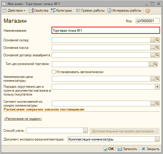 После того, как были указаны сведения о складе, заполним реквизит «Основная касса» справочника «Магазин». Добавьте новый элемент в справочник «Кассы», укажите наименование, выберите тип кассы, организацию и магазин.