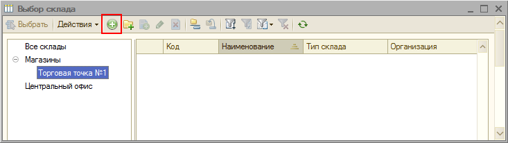 Заполните реквизит «Основной склад» справочника «Магазин». При добавлении появится форма списка справочника «Склады», которая разделена на две части. В левой части представлены магазины, которые уже созданы в информационной базе. В правую часть списка нужно добавить список складов каждого магазина. Укажите магазин, для которого будет добавлен склад, и нажмите команду «Добавить».