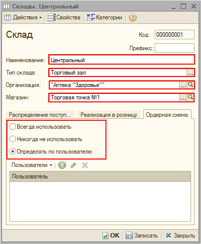 - «Определять по пользователю» — поступление и реализация товаров по ордерной схеме будут иметь право осуществлять только указанные в списке пользователи.