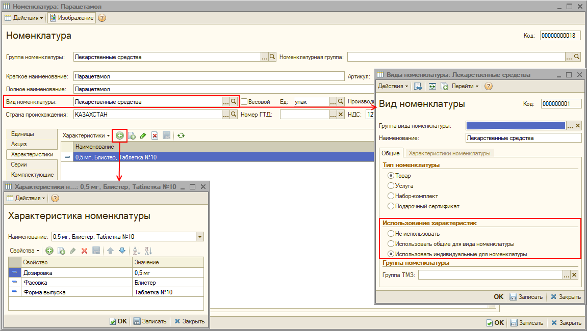 Учет лекарственных средств можно вести в разрезе характеристик. Каждая характеристика содержит информацию по дозировке, фасовке и форме выпуска номенклатуры. Возможность ведения учета лекарственных средств в разрезе характеристик зависит от вида номенклатуры.
