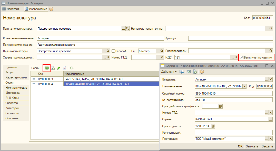 Чтобы добавить новую серию, перейдите на закладку «Серии». Для одной номенклатуры можно вводить неограниченное количество серий.