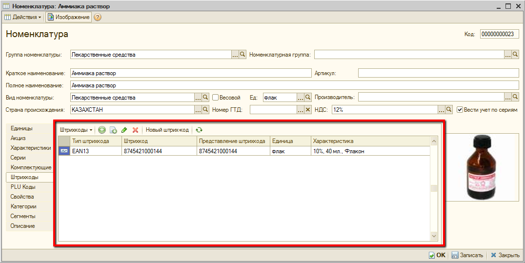 Если Вы планируете работать с товарами с помощью сканера штрих-кода, то заполните информацию по штрих-кодам для лекарственного средства на закладке «Штрихкоды». Штрих-коды могут быть заданы в разрезе единиц измерения и характеристик номенклатуры.