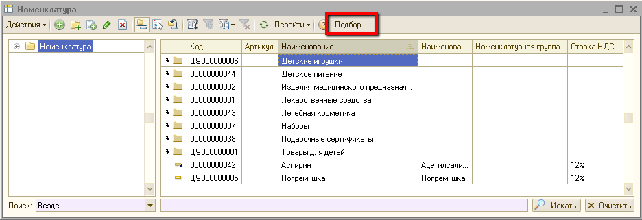 Для добавления номенклатуры из «Государственного реестра лекарственных средств» на форме списка справочника «Номенклатура» предназначена команда «Подбор».