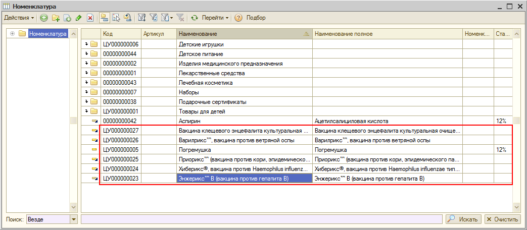 Перед добавлением номенклатуры желательно определить иерархическую структуру номенклатурных позиций (например, «Лекарственные средства», «Изделия медицинского назначения», «Детское питание» и так далее). Для быстрого поиска позиции номенклатуры при подборе товаров в документах используется иерархическая структура. Для создания иерархии заполните реквизит «Группа номенклатуры».