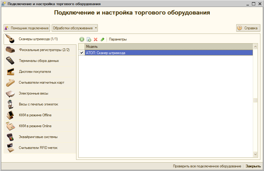 С дополнительной информацией по подключению и настройке торгового оборудования можно ознакомиться на диске ИТС в разделе «Разработка и администрирование» → «Библиотека подключаемого оборудования».