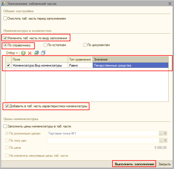 Заполните табличную часть только информацией по справочнику «Номенклатура». Для этого установите переключатель «По справочнику», в поле отбора добавьте критерий, например, «Вид номенклатуры» равно «Лекарственные средства». Установите флаг «Добавить в табличную часть характеристики номенклатуры», если необходимо заполнить колонку «Характеристика». После указания критериев нажмите кнопку «Выполнить заполнение».