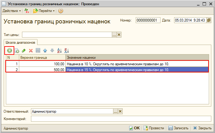 Для определения наценки в зависимости от цены закупки необходимо создать документ «Установка границ розничных наценок» (меню «Документы» → «Ценообразование» → «Установка границ розничных наценок»).