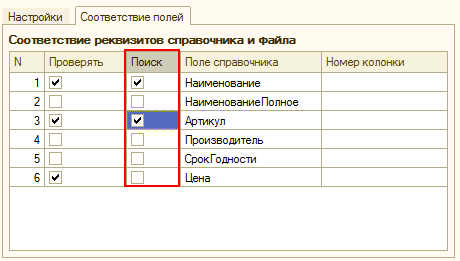 Теперь необходимо настроить соответствие полей между структурой файла прайс-листа и реквизитами справочника «Номенклатура поставщиков». Данные из прочитанного прайс-листа будут записываться в справочник «Номенклатура поставщиков». На закладке «Соответствие полей» расположена таблица, в которой выполняется настройка загрузки информации. Таблица состоит из следующих колонок: «№», «Проверять», «Поиск», «Поле справочника» и «Номер колонки».