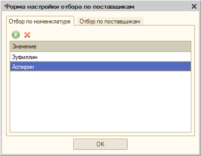 Если хотите установить отбор по наименованию лекарственного средства необходимо ввести наименование в поле ввода «Номенклатура» расположенном в верхней части формы отчета. Чтобы выполнить отбор по нескольким лекарственным средствам, воспользуйтесь формой настройки отборов. В данной форме добавьте необходимые значения на закладке «Отбор по номенклатуре».