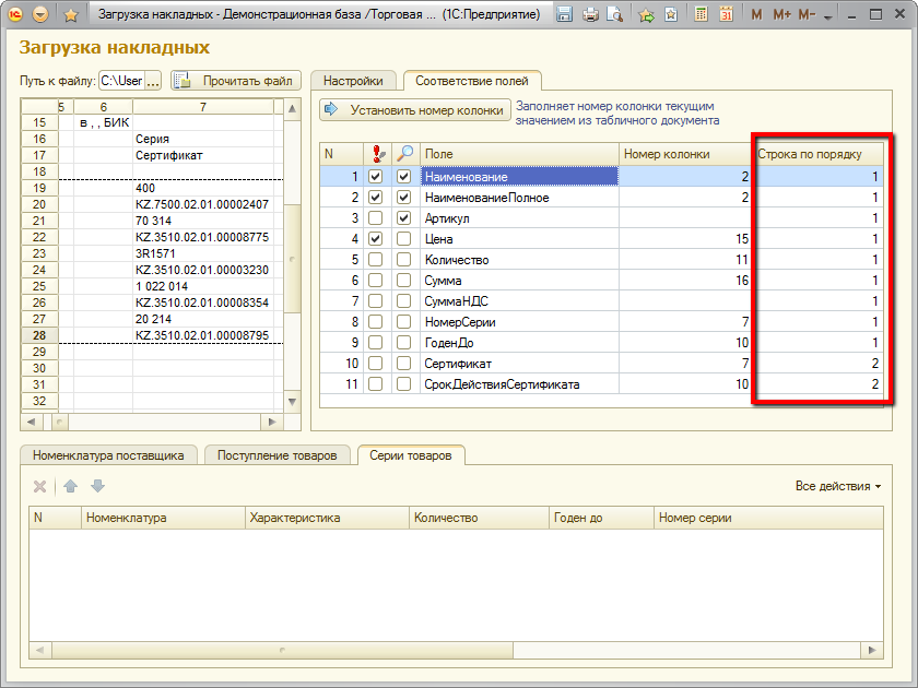 В колонке «Строка по порядку» определите в какой именно строке находится значение загружаемого поля. В данном примере накладной поставщика информация о сертификате и сроке действия сертификата номенклатурной позиции находятся во второй строке. Следовательно, для строк «Сертификат» и «СрокДействияСертификата» необходимо указать значение «2».