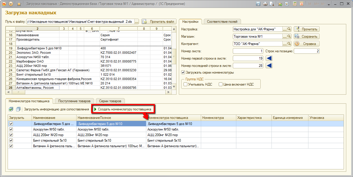 В момент загрузки выполняется поиск ранее загруженной номенклатуры поставщика. Поиск выполняется по полям, которые мы определили как поля поиска: «Наименование», «Наименование полное» и «Артикул». Найденная номенклатура поставщика загружается в колонку «Номенклатура поставщика» обработки «Загрузка накладных», если это первая загрузка информации, то колонка будет пустая. Создать элементы справочника «Номенклатура поставщика» можно с помощью кнопки «Создать номенклатуру поставщика». По данным накладной, в соответствии с настройкой, заданной для поставщика, будут созданы номенклатурные позиции.