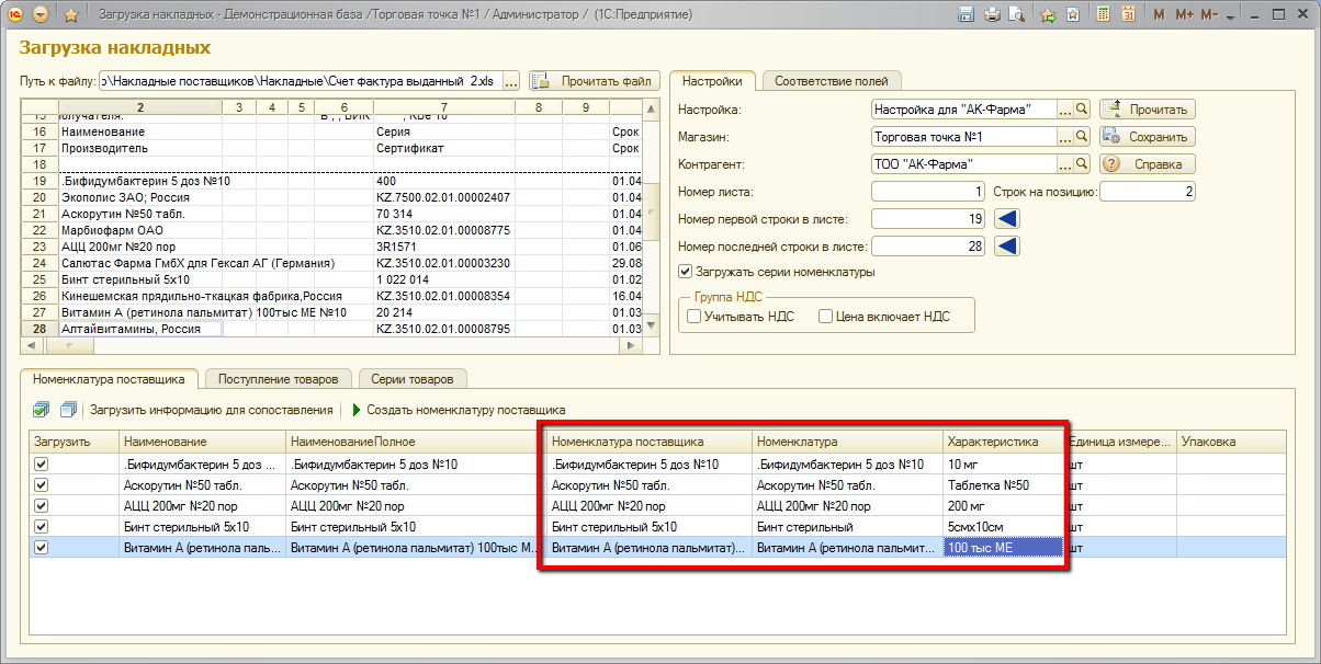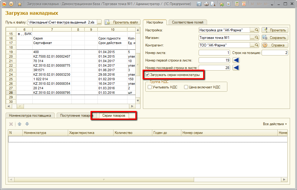 - «Загружать серии номенклатуры» — флаг определяет необходимость загрузки информации о сериях номенклатуры. В примере накладной представлена информация по сериям номенклатуры, поэтому установим данный флаг. При установленном флаге «Загружать серии номенклатуры» становится доступной закладка «Серии товаров». Закладка «Серии товаров» будет заполнена сериями номенклатуры из накладной поставщика.