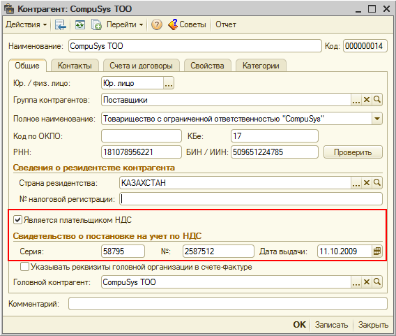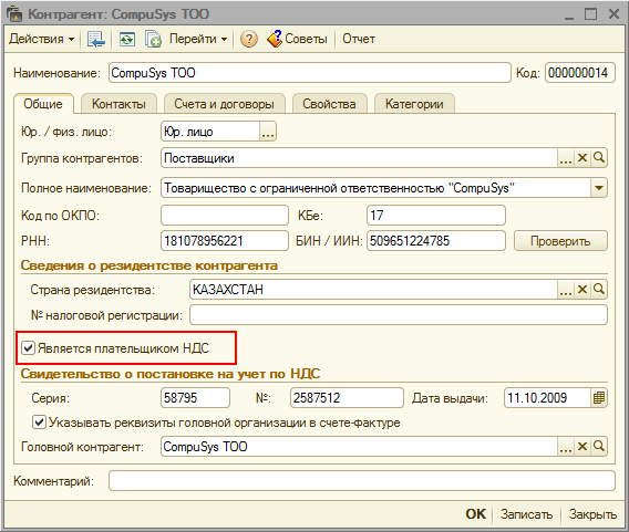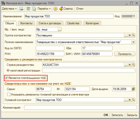 В карточках контрагентов, которые являются плательщиками НДС, необходимо установить признак «Является плательщиком НДС».