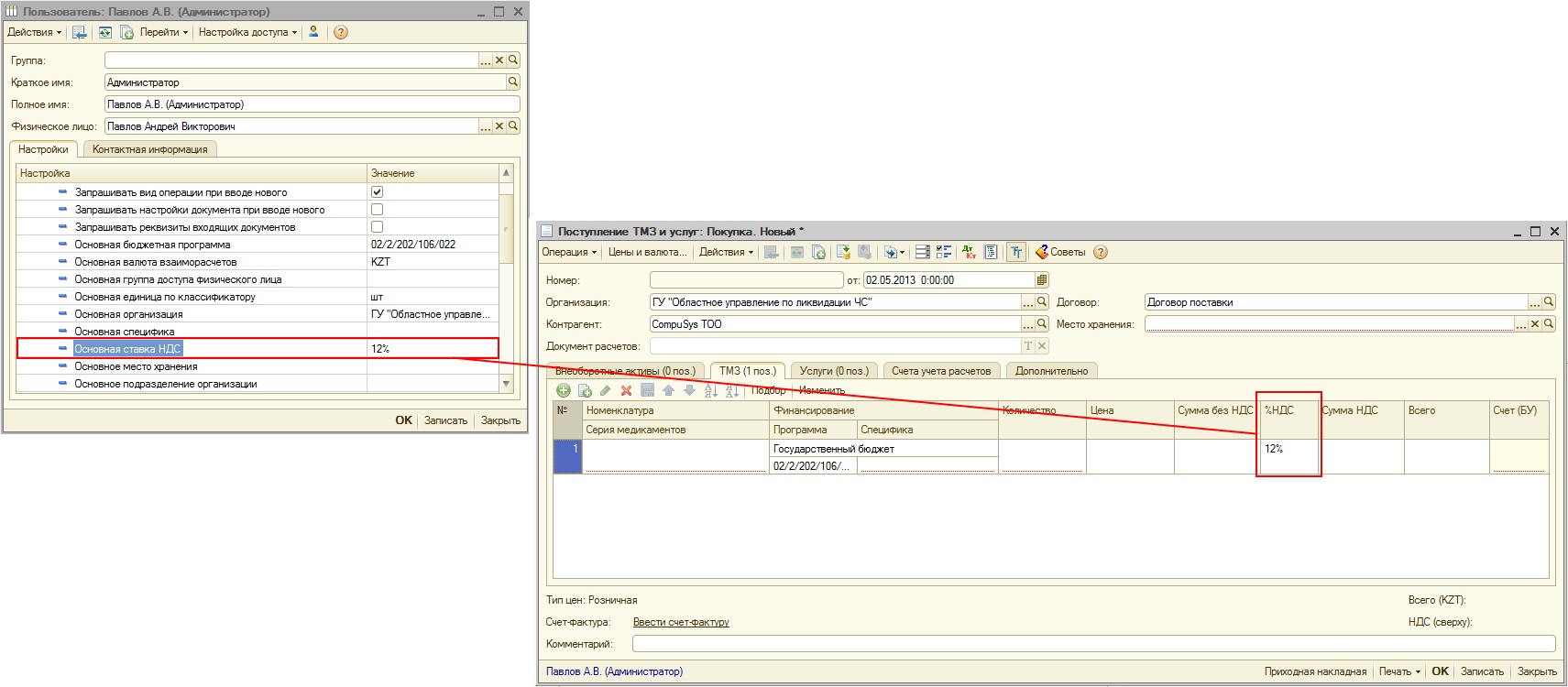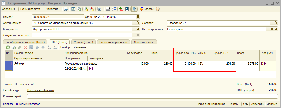 При этом, ставка НДС в табличных частях документов поступления заполняется в соответствии с заданными настройками пользователя.