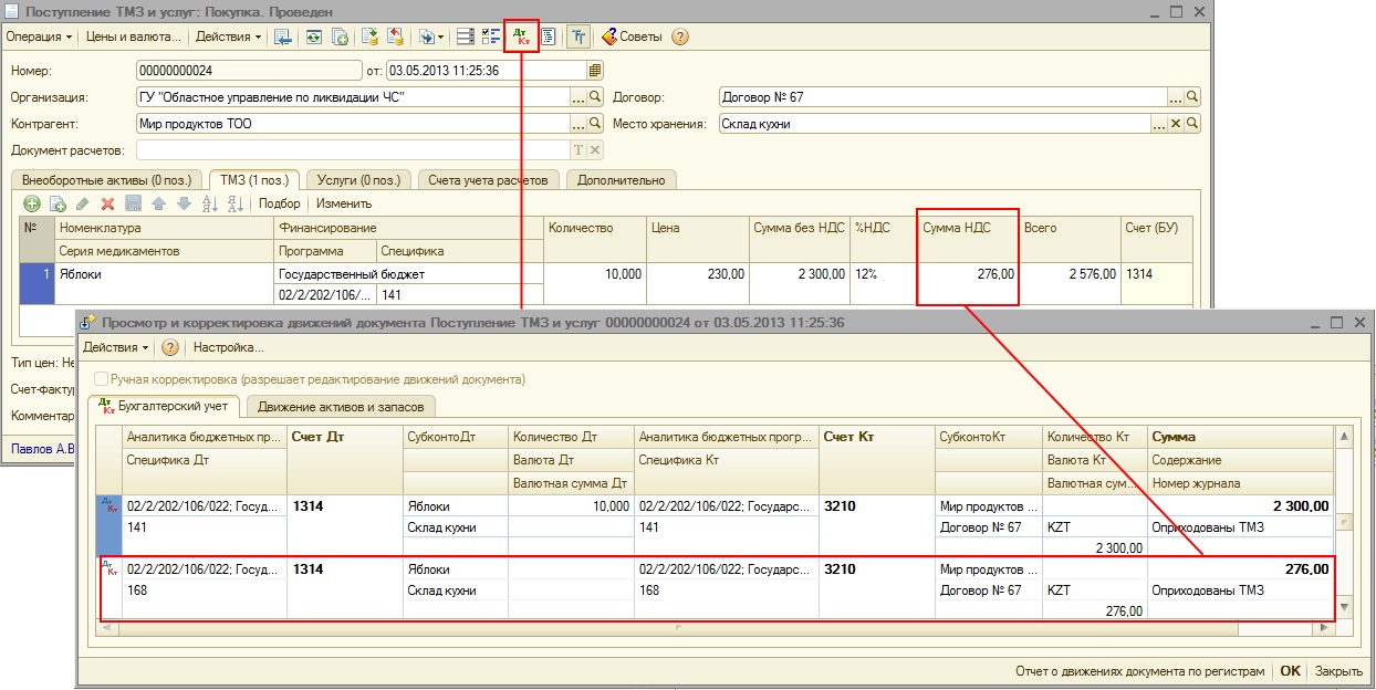 После выполнения данной обработки, документами поступления помимо движений по основной специфике учета активов будут сформированы движения на сумму НДС по специфике с кодом «168».