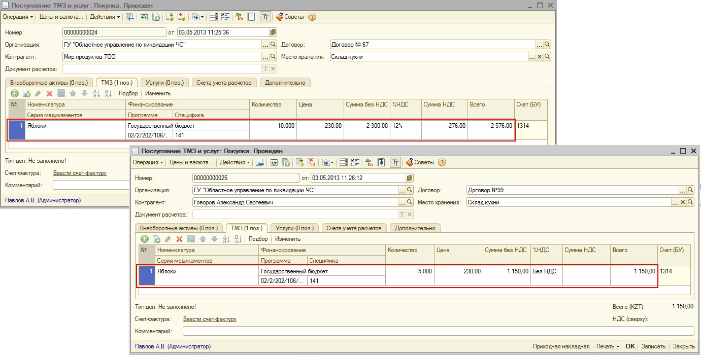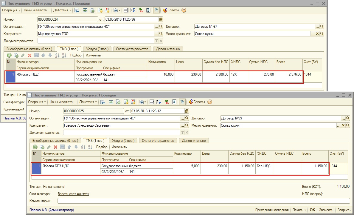 Если используется способ оценки запасов «По средней» и необходимо, чтобы при списании ТМЗ, приобретенных без НДС, затраты по НДС не возникали рекомендуется создавать два элемента справочника «Номенклатура». Например, для яблок, приобретаемых с НДС, необходимо создать номенклатуру «Яблоки с НДС», а для яблок, приобретаемых без НДС – номенклатуру «Яблоки БЕЗ НДС». Тогда документы поступления будут выглядеть следующим образом: