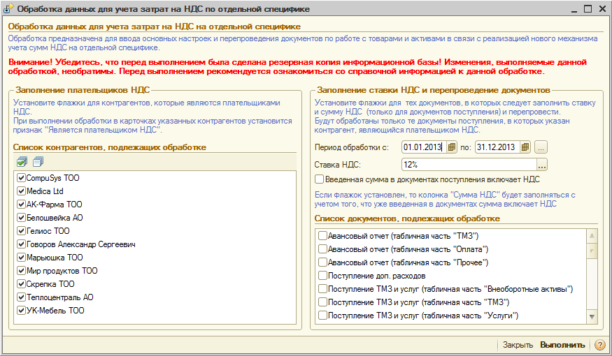 После заполнения ставки и суммы НДС можно приступить к процедуре перепроведения документов, которая запускается по нажатию кнопки «Выполнить». Обработке будут подлежать только те документы, у которых в качестве контрагента указан плательщик НДС. Если в строке табличной части документа уже заполнена сумма НДС, то строка обрабатываться не будет. При обработке документов поступления, в табличных частях «ТМЗ» и «Услуги» будут пропускаться те строки, для которых в этом же документе присутствует строка с отдельной строкой поступления данного актива по 168-ой специфике, и об этом будет выдано сообщение.