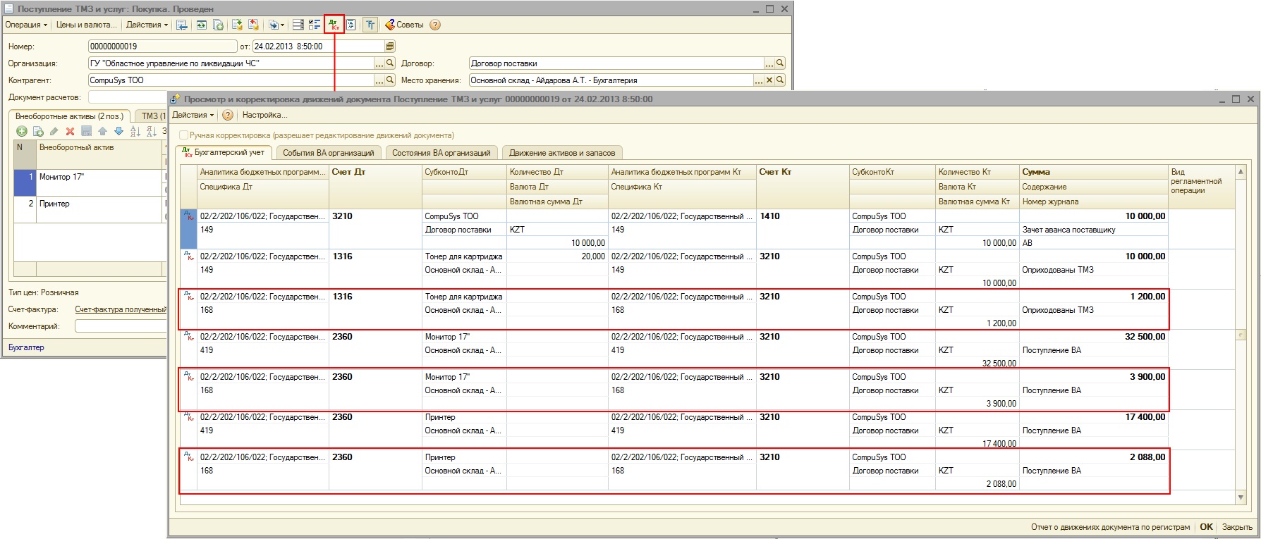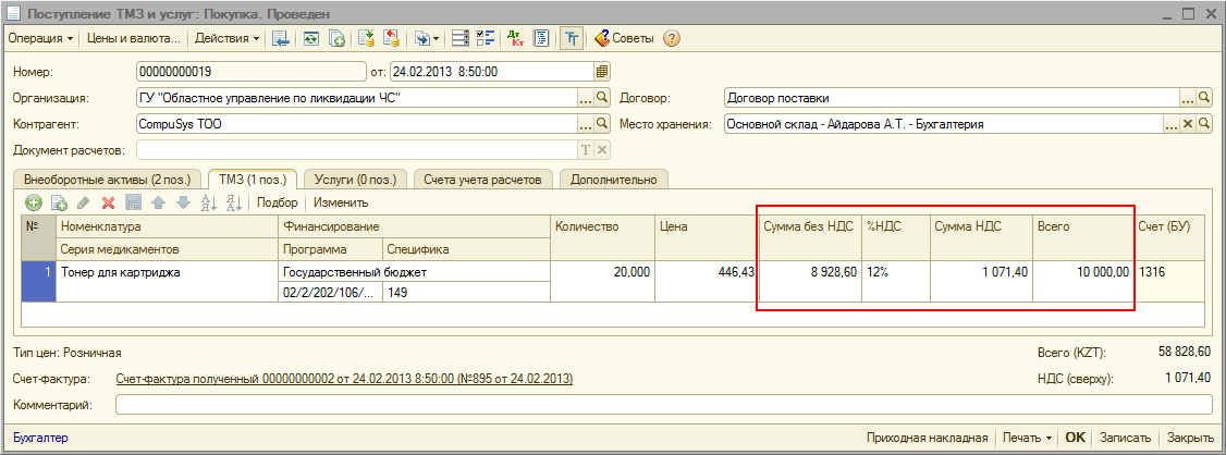 Если установлен признак «Введенная сумма в документах поступления включает НДС», то колонка «Сумма НДС» в табличных частях документов будет заполняться с учетом того, что уже введенная сумма включает НДС. Например, если в табличной части «ТМЗ» документа «Поступление ТМЗ и услуг» указана сумма 10 000 тг. и значение ставки НДС выбрано 12%, то при выполнении обработки с установленным признаком «Введенная сумма в документах поступления включает НДС» значение в колонке «Сумма НДС» будет равно (10 000 тг. * 12%)/(100% + 12%) = 1 071,4 тг., при этом в колонку «Сумма без НДС» будет записано значение 10 000 – 1 071,4 = 8 928,60 тг. При этом, по основной специфике учета запаса будет сформирована проводка на сумму 8 928,60 тг., а по специфике 168 будет сформирована проводка на сумму 1 071,4 тенге. Общая сумма проводки будет равна 10 000 тг.