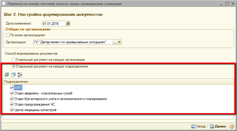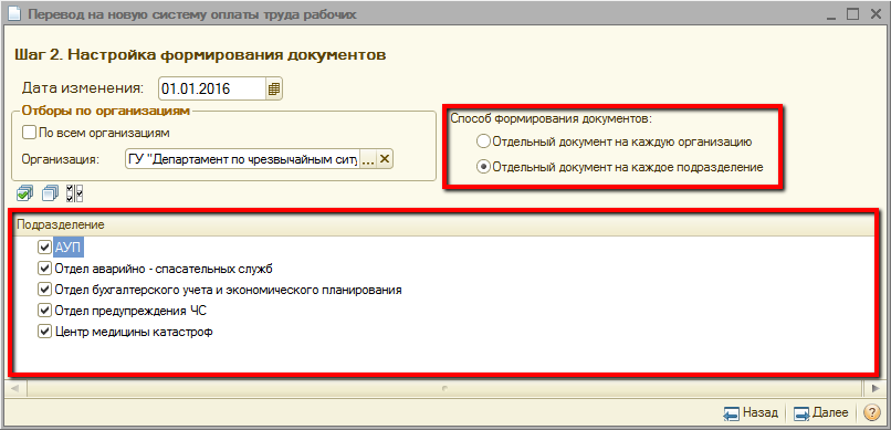 После установки необходимых настроек для перехода к следующему шагу необходимо нажать кнопку «Далее». Для возврата на предыдущий шаг необходимо нажать кнопку «Назад».